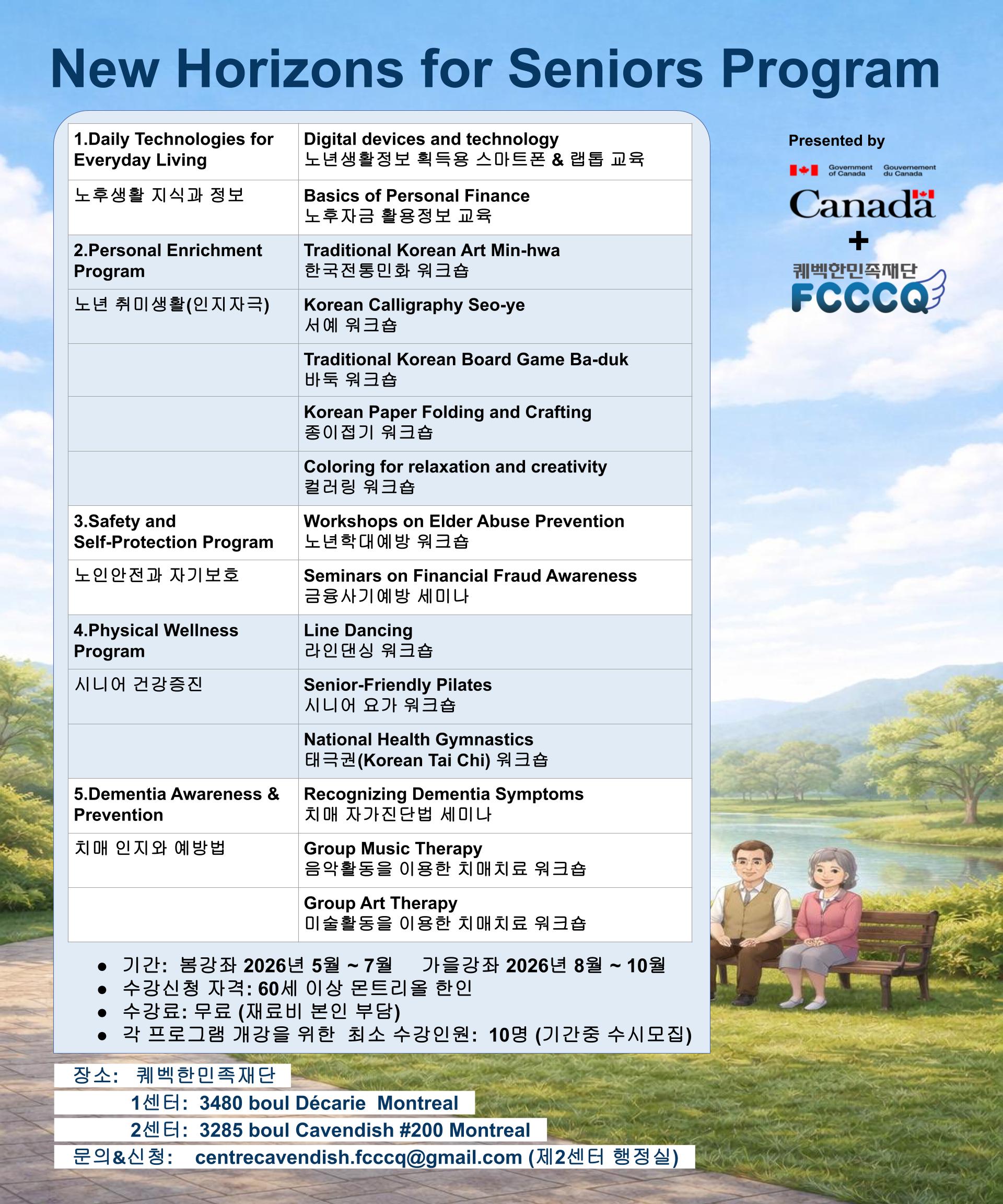 퀘벡한민족재단이 캐나다연방정부와 함께 몬트리올 한인사회의 노년층을 위한 복지 프로그램 NHSP 2026-2027을 아래와 같이 시행합니다. 이 프로그램은 퀘벡한민족재단이 2015년 '100세 건강교실'을 시작으로 '코코모 사랑방'을 포함 11년째 지속하고 있는 노년복지증진사업의 일환입니다. 많은 한인 시니어들이 이 프로그램에 참가하여 노후생활에 필요한 지식과 정보를 습득하고, 이웃과 소통하며, 건강한 노후생활을 영위하시기 바랍니다.